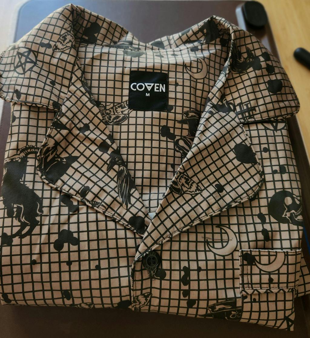 Knöpfe mit eingraviertem COVEN-Siegel, ein dezentes Detail.